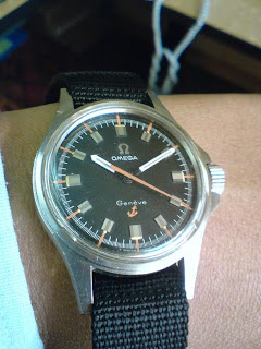 Ini disebut Omega Red Anchor Marine Military Watch, mesin putar cal 601, 17 jewels, ca 1964, ref number 135 015, size 37 mm. Ciri khasnya ada lambang jangkar merah di atas angka 6. Saya hanya pernah lihat dua kali di internet, satu di filipina dan satu di Eropa (search di nostalgia times). Kalau di sini saya hanya lihat yang satu ini saja. Konon katanya ini didisain untuk marinir. Saya sendiri tidak yakin apakah ini benar-benar dipakai oleh marinir atau hanya model saja (marine look atau apalah). Tetapi memang unik. Perhatikan kenopnya (crown) memakai pelindung (crown guard), seolah olah memang arloji untuk luar ruang bukan arloji fashion atau dress. Tetapi uniknya dial arloji ini warna warni ya...jadi seperti tidak tampil garang sebagaimana lazimnya arloji militer.
